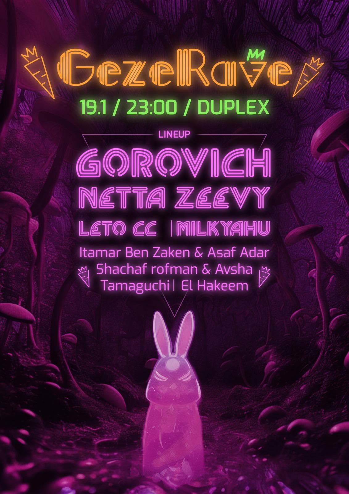 🐰 GOROVICH – אחרי שניגן בבום, באוזורה, בבבילון ועוד מלא פסטיבלים מסביב לעולם, גורביץ' מגיע להטריף את הגזרייב בלייב סט! עם פרוגרסיב-טראנס מקפיץ ופסיכדלי, גורוביץ' יעביר אותנו שעות כל כך מיוחדות בלילה שלא נבין איך הוא לא התקשר בוקר אחרי, וכל מה שנרצה זה לשמוע אותו ממשיך לנגן.