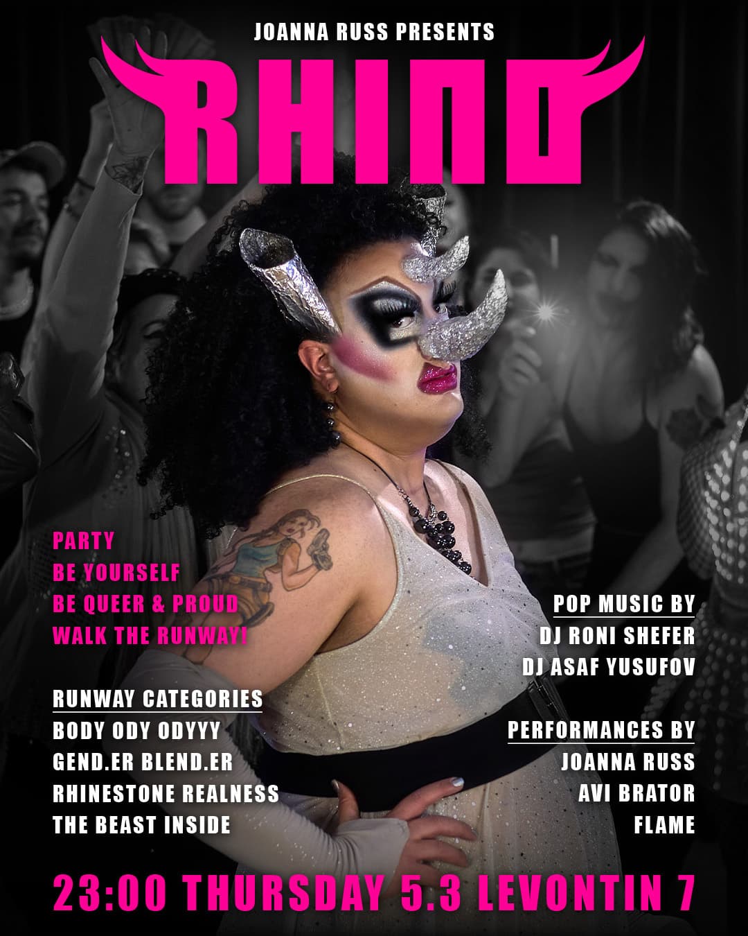 RHINO ✨ A queer party for people of all kinds, shapes, genders and preferences - welcoming everyone without any judgement. Come dance with us in a pop-drag party with a RUNWAY in the middle of it. Walking the runway categories will be hosted by drag queen Joanna Russ & Noa Kfetzulee!